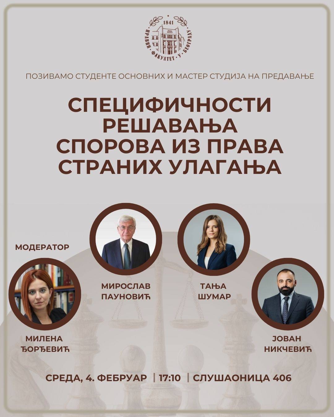 Poziv za predavanje "Specifičnosti rešavanja sporova iz prava stanih ulaganja"